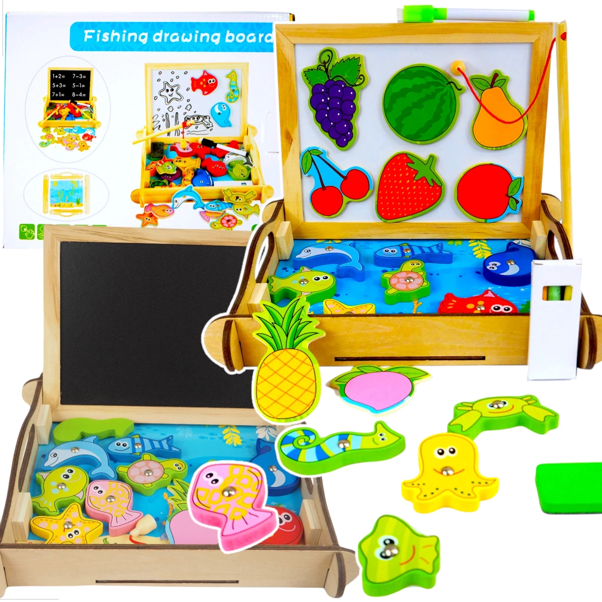 DREWNIANA TABLICA DWUSTRONNA PISANIE ŁOWIENIE RYBEK WĘDKI RYBKI OWOCE