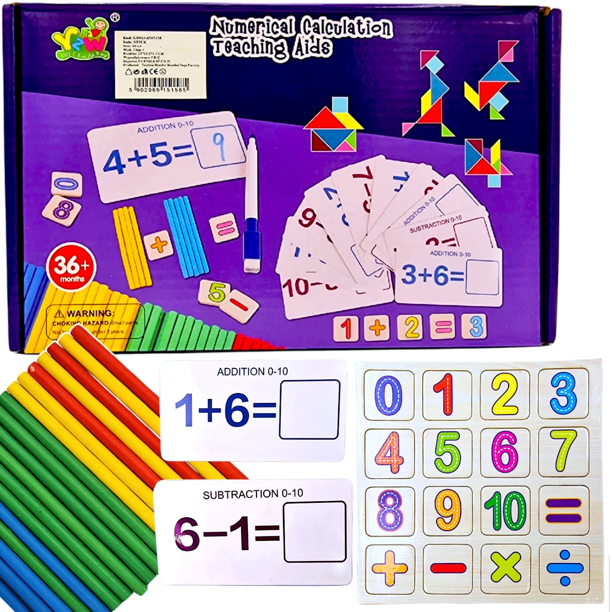 Wielofunkcyjny drewniany zestaw matematyczny to idealna zabawka dla każdego maluszka. Ten zestaw to przydatna pomoc dydaktyczna w nauce liczenia. Dziecko podczas zabawy ma możliwość nauki cyferek oraz pierwszych działań. Patyczki oraz fiszki do nauki liczenia to niezastąpiony produkt, który ułatwi dziecku przyswajanie liczb.