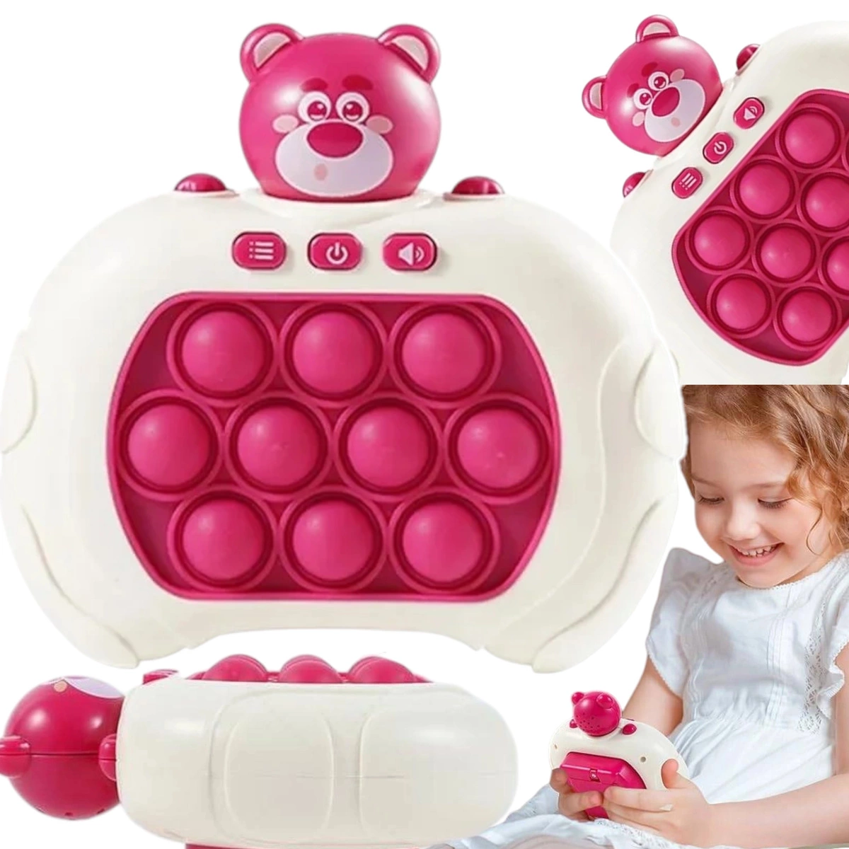 Nasza konsola przenośna z grą Pop It to zabawka, która łączy w sobie naukę i zabawę, rozwijając umiejętności manualne i koordynację wzrokowo-ruchową dziecka. Dzieci uczą się rozpoznawania kształtów, kolorów i dźwięków, jednocześnie ciesząc się różnorodnymi interakcjami. Z pewnością przyniesie wiele radości nie tylko najmłodszym!