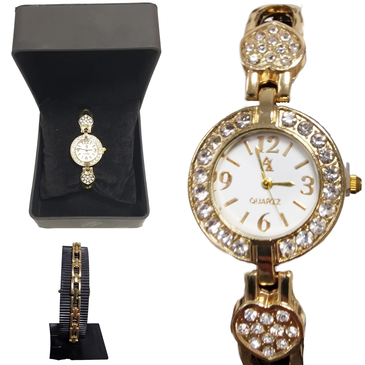 KLASYCZNY ZŁOTY ZEGAREK DAMSKI CYRKONIE PUDEŁKO ZE SKÓRY KWARCOWY PREZENT