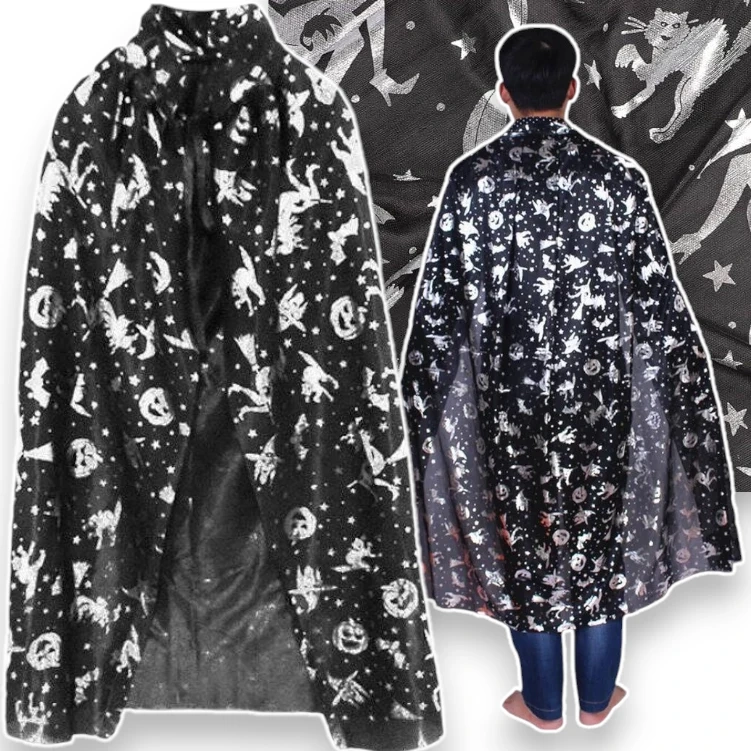 Ta peleryna na Halloween to idealny dodatek do każdego stroju na tę wyjątkową noc! Wykonana z lekkiego materiału, ozdobiona srebrnymi wzorkami, takimi jak dynie, czarownice, nietoperze, gwiazdy i miotły, wprowadzi Cię w mroczny klimat Halloween. Dzięki uniwersalnym wymiarom pasuje zarówno na dzieci, jak i dorosłych, co czyni ją świetnym wyborem na imprezy, zabawy w przebieranki, czy tematyczne sesje zdjęciowe.