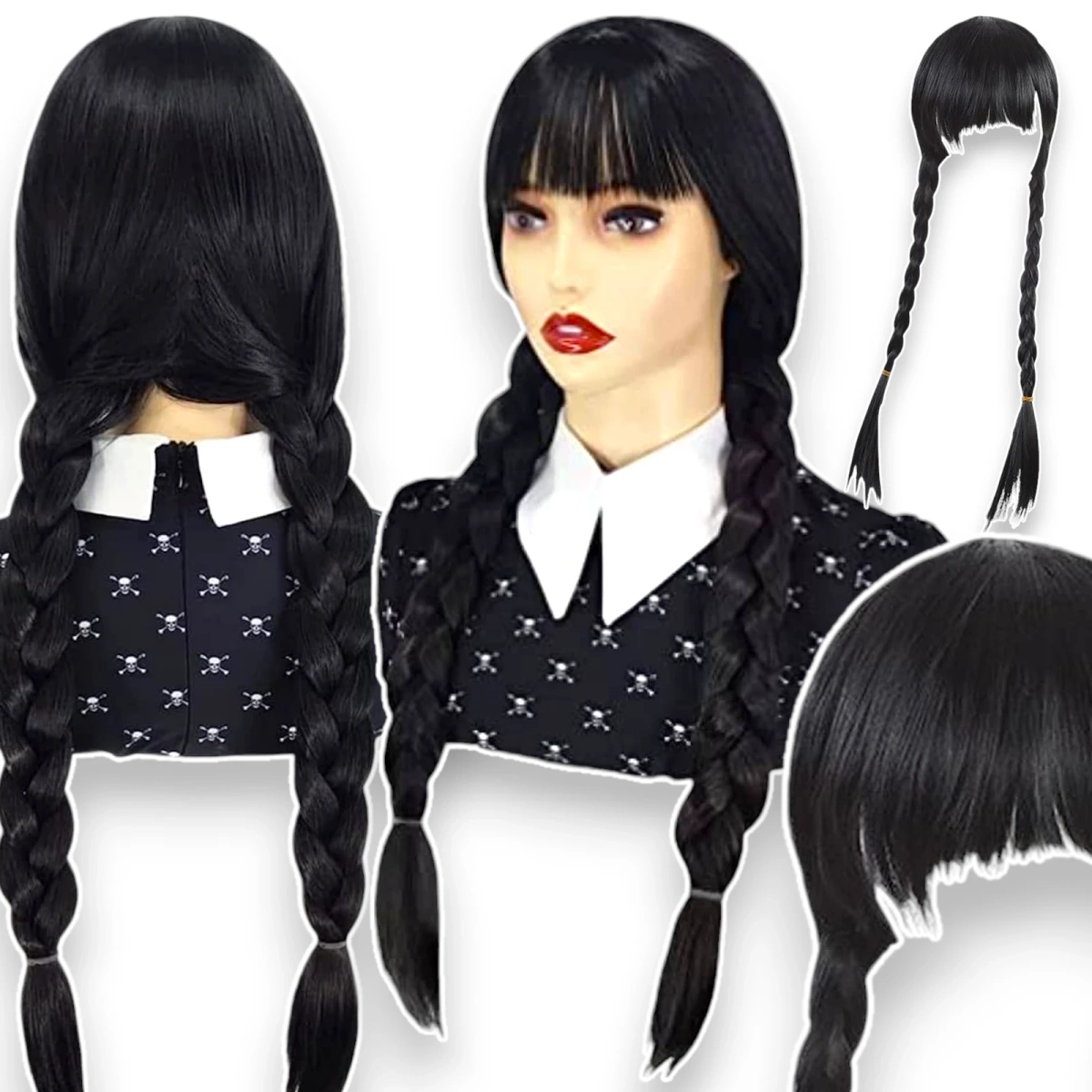 PERUKA WEDNESDAY ADDAMS WŁOSY COSPLAY WARKOCZE Z GRZYWKĄ 60CM NA IMPREZĘ