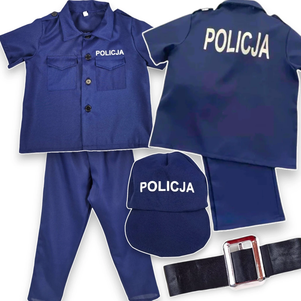 Kompletne Wyposażenie: Zestaw zawiera czapkę z daszkiem, pasek oraz dwuczęściowy kostium składający się z koszuli policyjnej z krótkim rękawem i spodni.