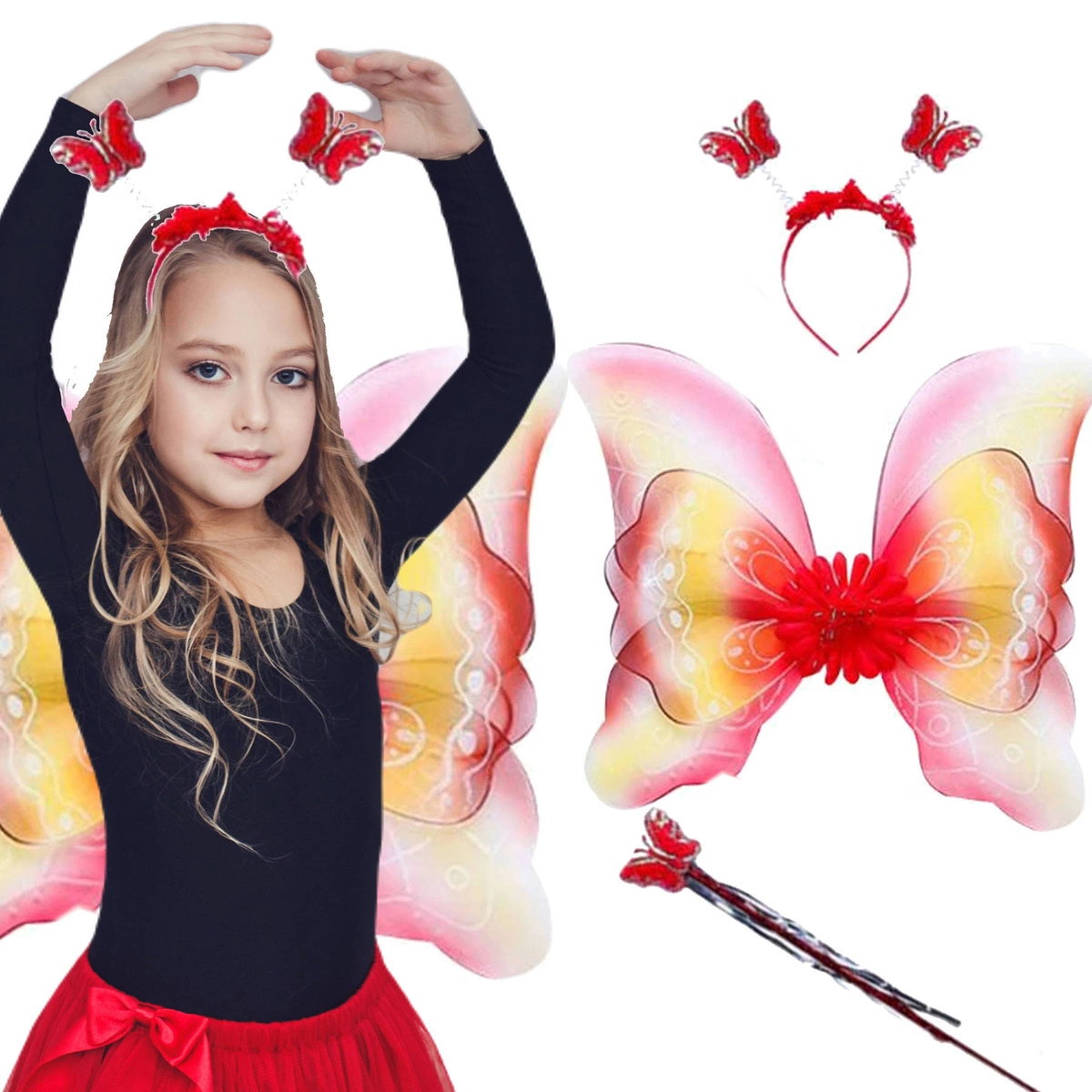 Ten śliczny strój motylka to prawdziwa perełka, która na pewno wyróżni Cię z tłumu. Składa się on z trzech części - skrzydełek, różdżki motylkowej, opaski. Skrzydełka zostały posypane pięknym brokatem. Dzięki temu, przebranie mieni się w niezwykły sposób, co z pewnością przyciągnie uwagę wszystkich dookoła. Również motylkowa różdżka oraz opaska zostały ozdobione metalicznym materiałem, co nadaje im jeszcze więcej blasku. Jeśli chcesz wyglądać jak prawdziwy motyl i roztaczać wokół siebie magię, to jest to strój idealny dla Ciebie!