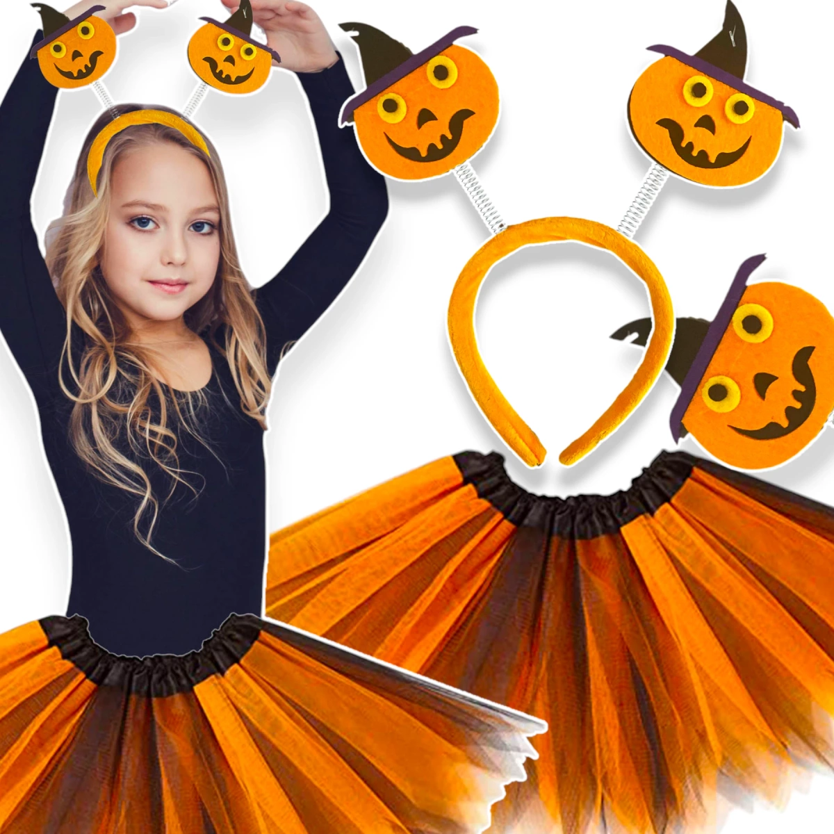 Fantastyczny zestaw dla każdej małej dziewczynki. Strój zawiera spódniczkę oraz opaskę na głowę z dyniami! Ten zestaw to idealne rozwiązanie na bal przebierańców, urodziny tematyczne, do codziennych zabawa dziecka oraz halloween, które stało się popularną imprezą. Strój idealnie sprawdzi się na tę imprezę, dzięki niemu dziecko wczuje się w fantastyczny nastrój tego święta.