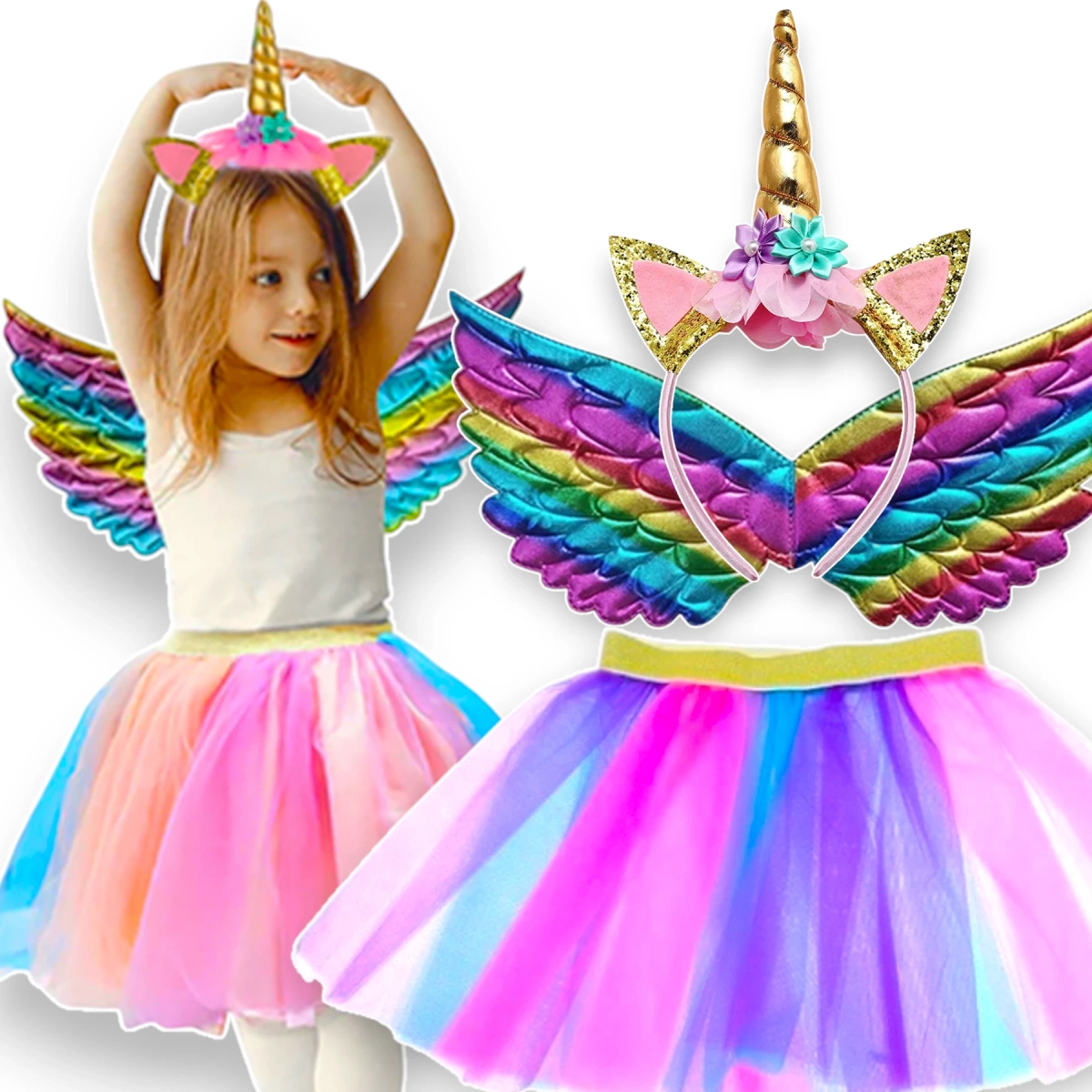 STRÓJ JEDNOROŻEC ZESTAW 3w1 SKRZYDŁA OPASKA SPÓDNICZKA TĘCZOWA KOLOROWA
