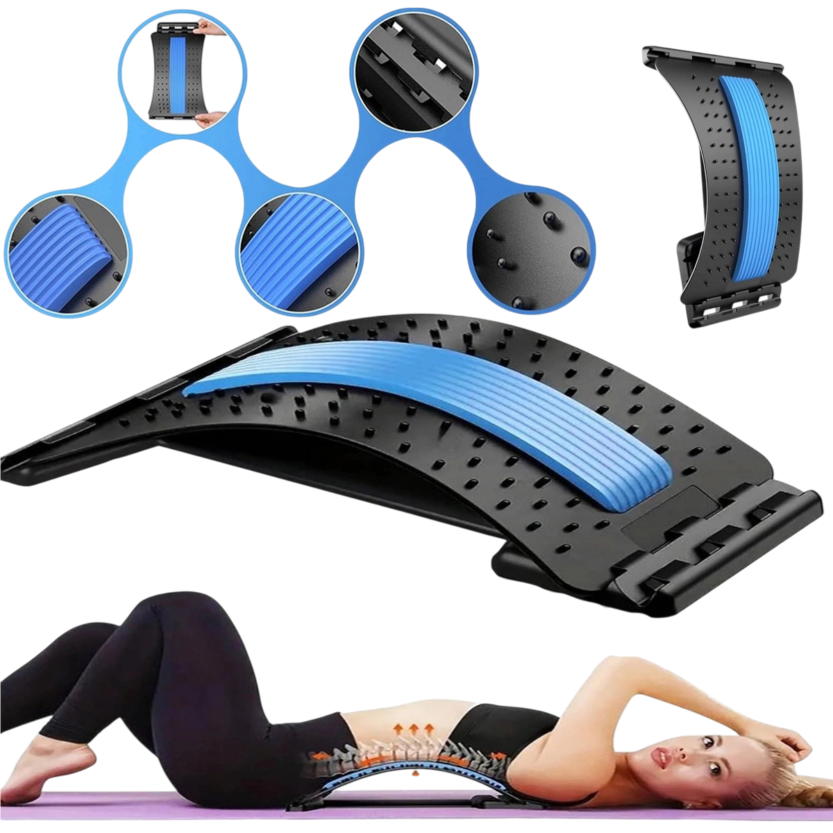 Urządzenie działa zarówno jako przyrząd do rozciągania pleców, jak i masażer. Wypustki masujące stymulują przepływ krwi, rozluźniając napięte mięśnie i wspierając regenerację.