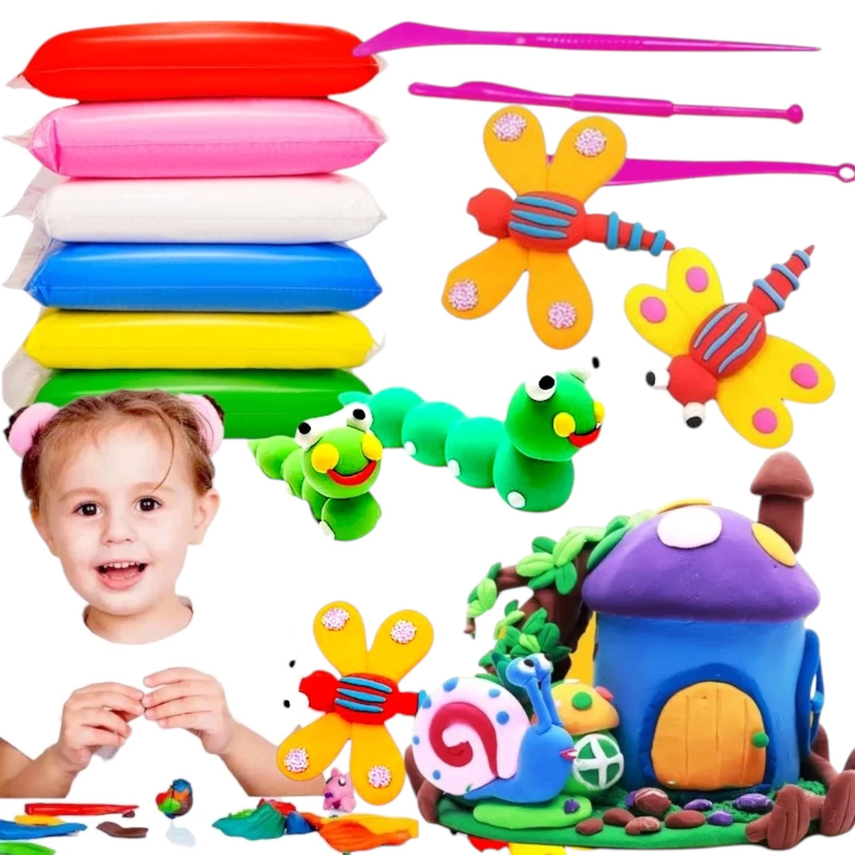 - Zestaw zawiera: 6 kolorów masy + 3 szpatułki do modelowania