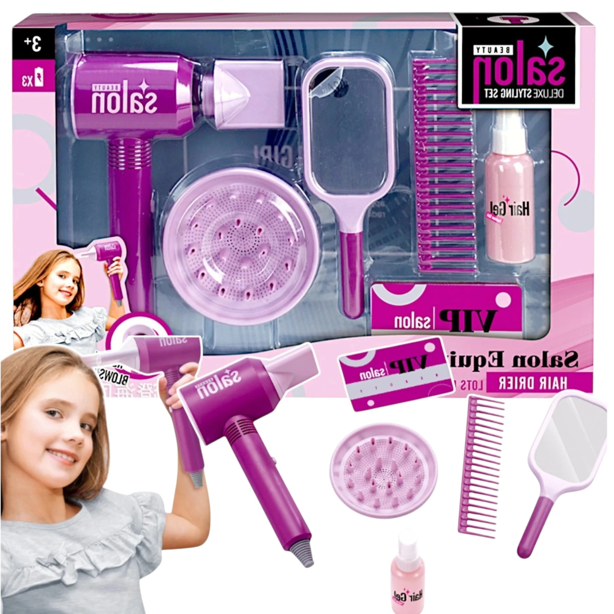 - Zestaw zawiera: suszarka, lusterko, grzebień, szczotka, żel do włosów (imitacja), końcówki do suszarki